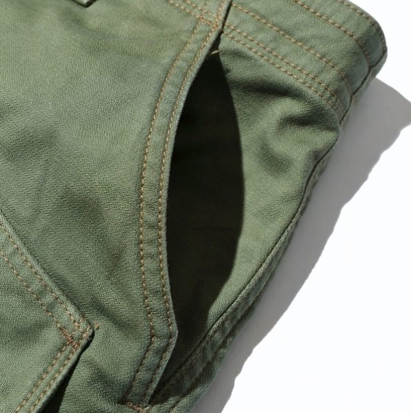 フロントにはスラッシュポケット・腿部分にフラップ付きポケットが付属されており機能性と収納力は優れています。