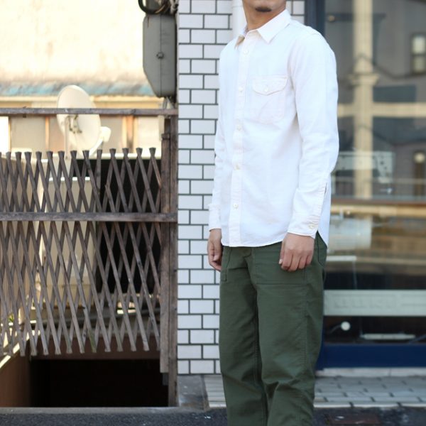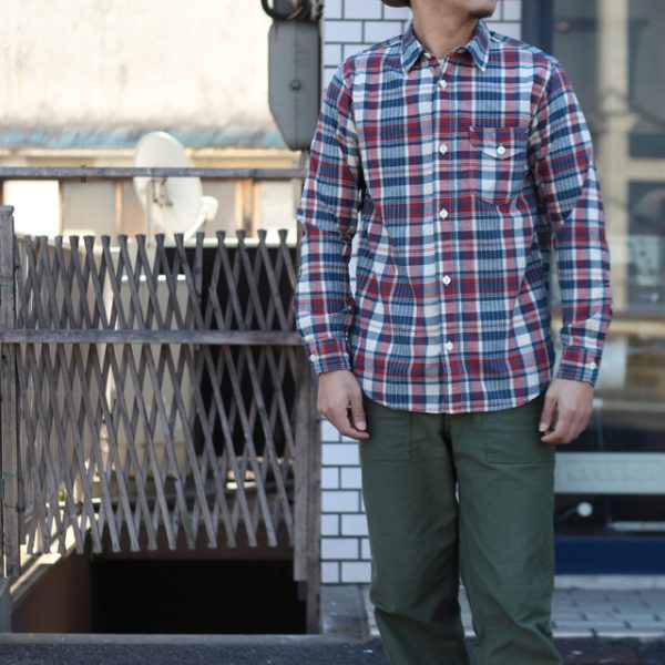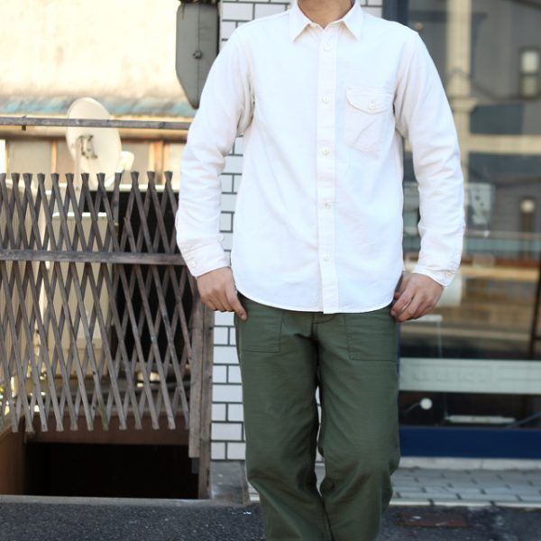 この辺のワークシャツは1枚持っていると、とても使えるアイテムですね。ジーンズ・ワークパンツ・トラウザーなどなど…幅広く合わせて頂けます。袖捲って夏場着てもカッコ良いですね!!