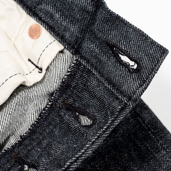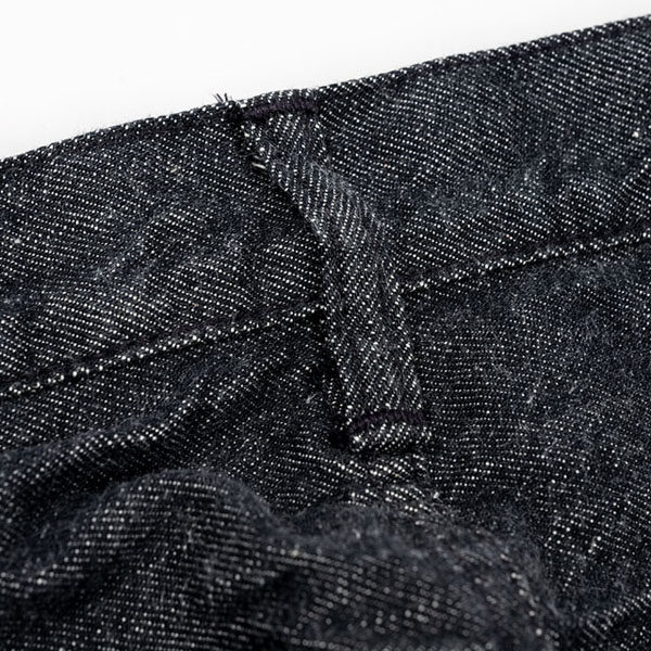 硫化ブラック染めのオリジナルデニムでロープ染色の糸の芯まで染まっているインディゴデニムの激しいヒゲなどは出ませんが、耳のアタリなども出で独特な雰囲気に変化していきます。
