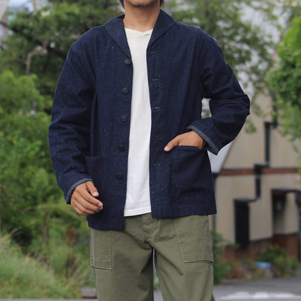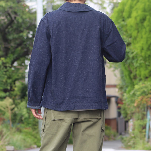 ボタンは別注で作ったオリジナルの樹脂製のチェンジボタン、襟はヘチマ襟、腰左右にはポケットがあり、携帯と鍵など小物を入れるにも便利です。
