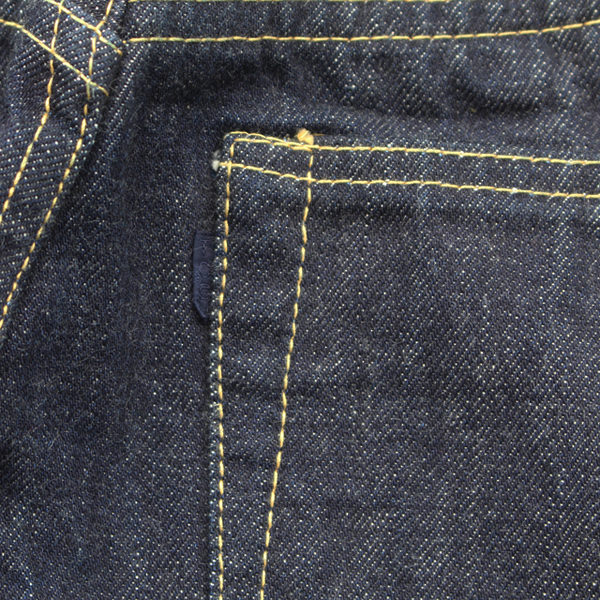 革パッチはディアスキン、トップボタンは月桂樹ボタン、持ち出しはタックボタン、補強リベット、V字ステッチ、隠しリベット、ベルトループ山高、ネル地スレキ、セルビッチ、インディゴタブなどが特徴的な仕様となっています。