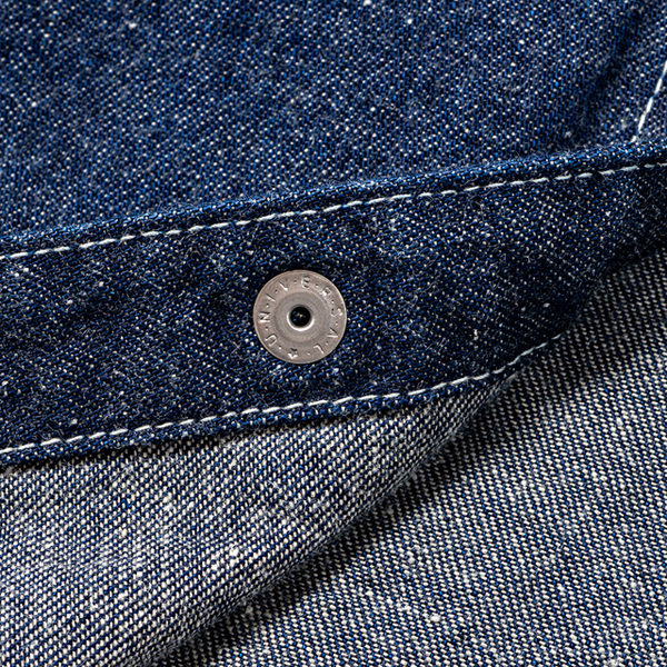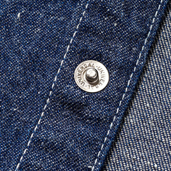 フロントはスナップボタン、裏はUNIVERSAL刻印、袖口ボタンは3連のボタン、背面にはアンブレラヨークなどが特徴的な仕様となっています。