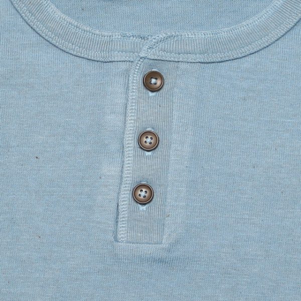 ヘンリーネックのボタンは天然のナットボタン。一つ一つ異なる素材感が味わい深いです。