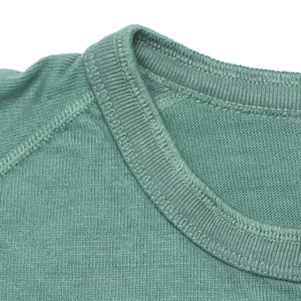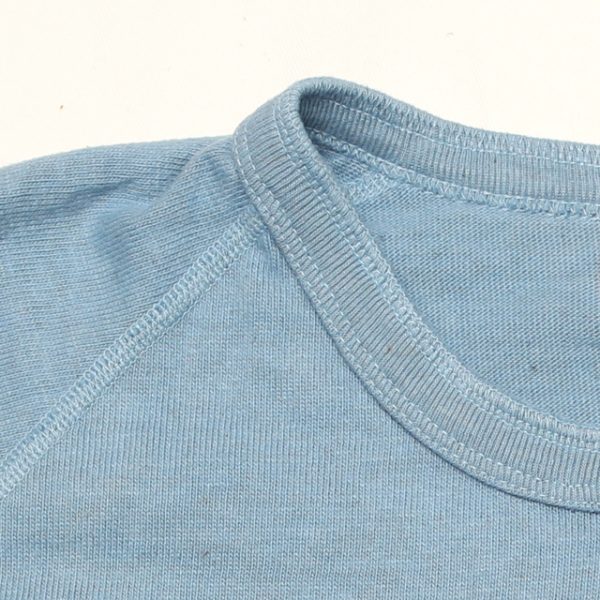 袖はラグランスリーブで縫製はフラットシーム(4本針縫製の特殊なミシンで難易度高く縫い目が平で肌にも優しく見た目もカッコ良い)ステッチが全体のアクセントとしてもデザインに落とし込まれています。