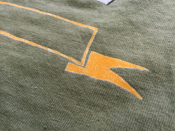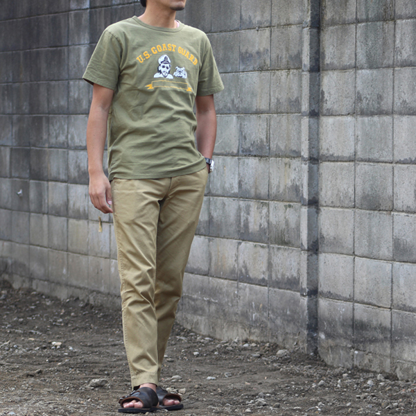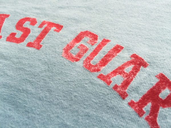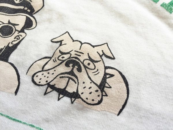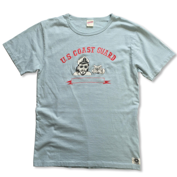 沿岸警備隊の隊長と戦う象徴のブルドッグをモチーフにゆるいタッチのグラフィックを、ひび割れプリントとフロッキープリントで併用し施されユーズドライクに落とし込んだアイテム。
